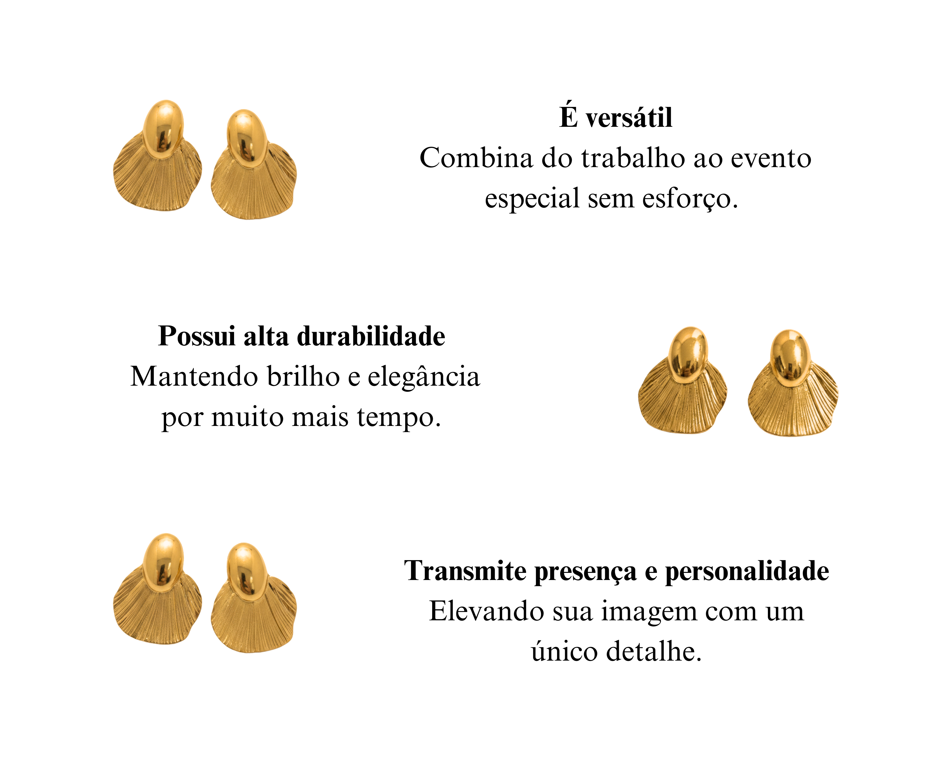 O Brinco Aço Inox Império é a definição de força e sofisticação em uma única peça. Seu design marcante combina uma base oval polida com acabamento espelhado e uma estrutura texturizada em formato orgânico que remete a raios de luz, criando profundidade, movimento e imponência. O dourado intenso transmite poder, elegância e personalidade — é o tipo de acessório que não passa despercebido.