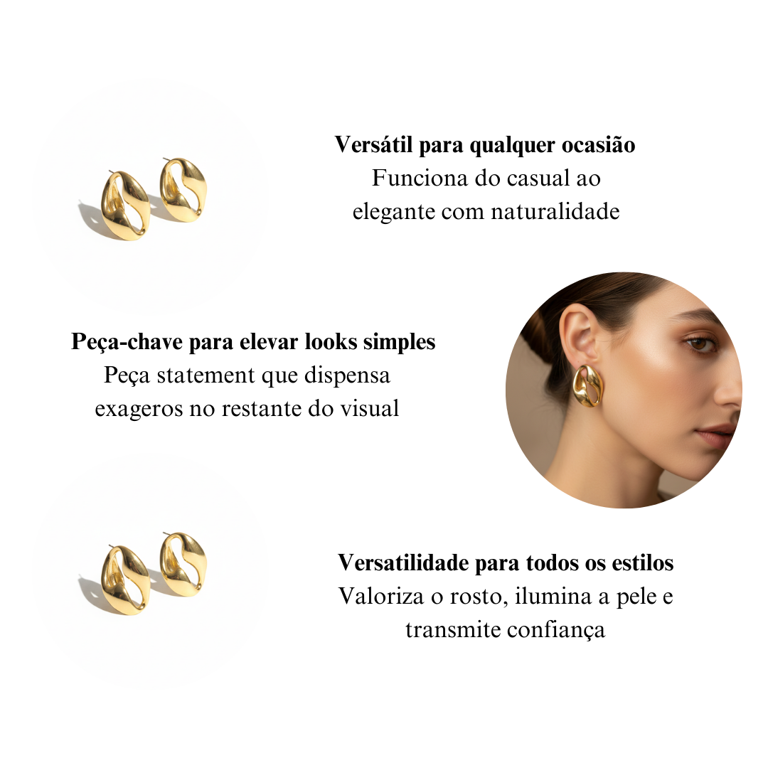 O Brinco Aço Inoxidável Dourado Imparável foi criado para quem não passa despercebida. Seu design orgânico com curvas fluídas transmite força e sofisticação ao mesmo tempo. O acabamento dourado polido reflete luz com intensidade, criando um efeito luxuoso que valoriza o rosto e eleva qualquer produção instantaneamente.