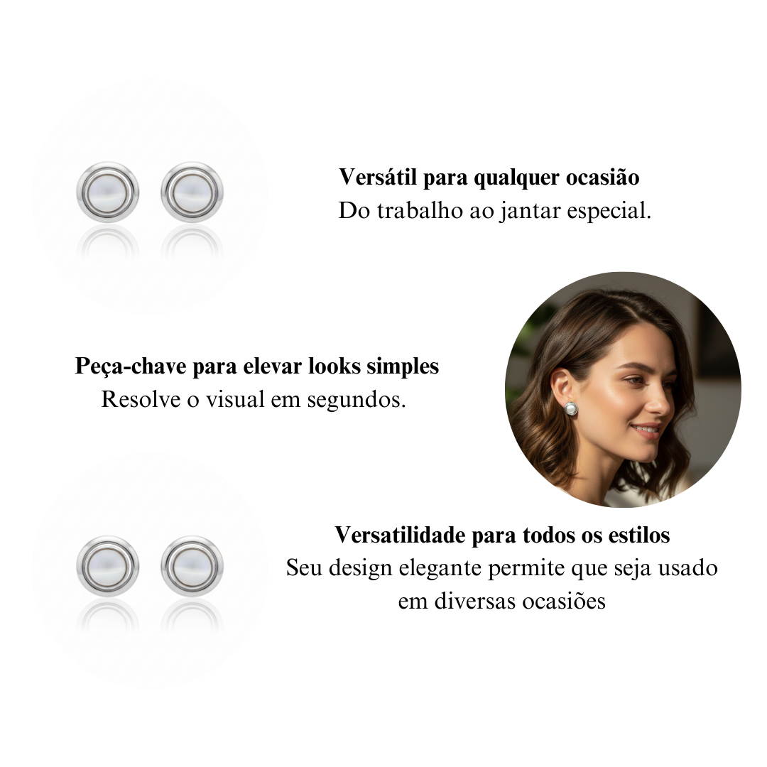 O Brinco Aço Inox Bela Aura é a definição de elegância sutil. Com design redondo, acabamento prateado polido e detalhe central em madrepérola suave, ele transmite leveza, sofisticação e feminilidade em cada detalhe. Uma peça atemporal que ilumina o rosto de forma discreta, mas marcante.