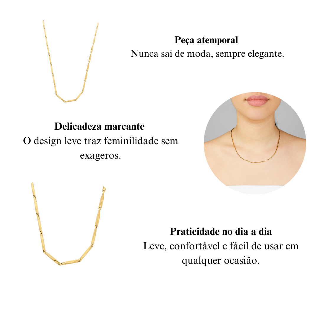 O Colar Aço Inoxidável Usei e Saí Resolvida é a definição de praticidade com estilo. Com seu design moderno e sofisticado, ele é a peça que transforma qualquer look em segundos. Feito em aço inoxidável dourado, garante brilho duradouro, resistência e elegância que acompanha você em todos os momentos, sem perder a leveza. É aquele colar que resolve sua produção em um piscar de olhos — basta colocar e já estar pronta para arrasar, seja no dia a dia ou em ocasiões especiais.