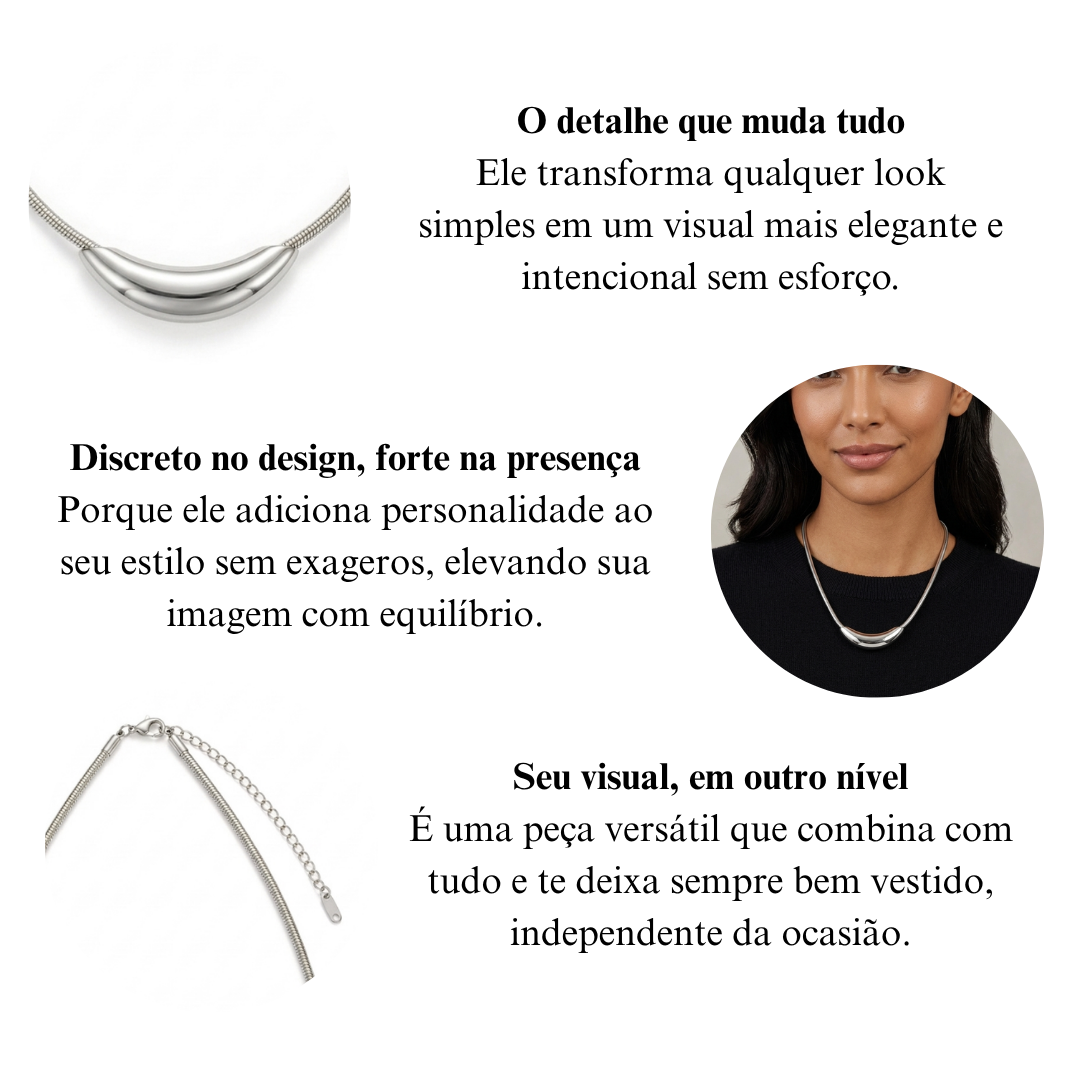 O Colar Choker Eclipse Silver é a definição de elegância moderna. Com linhas suaves e um detalhe frontal curvado que chama atenção na medida certa, ele entrega presença sem esforço. O acabamento polido em aço inoxidável reflete sofisticação, enquanto a corrente estilo snake traz um caimento perfeito no pescoço, valorizando qualquer composição. É aquele tipo de peça que transforma o básico em memorável — sem exagero, sem ruído, só estilo puro.