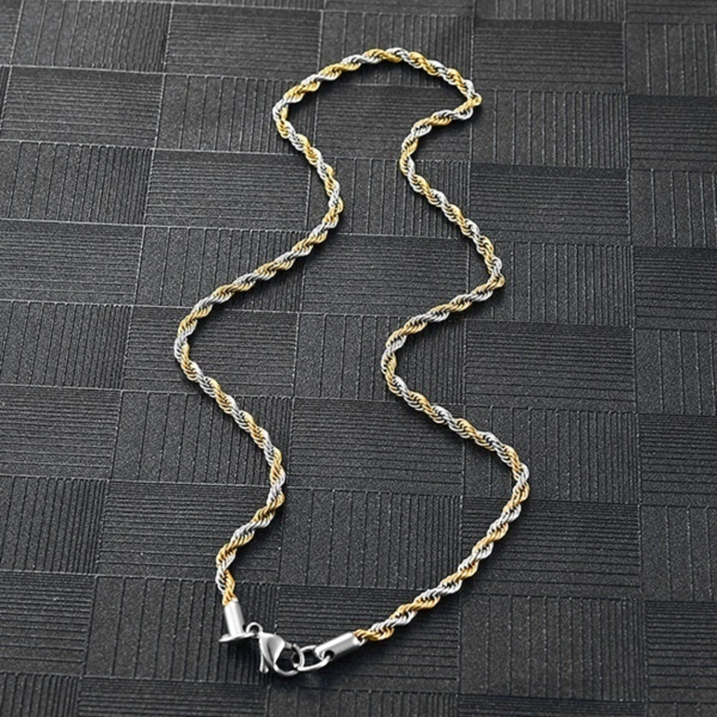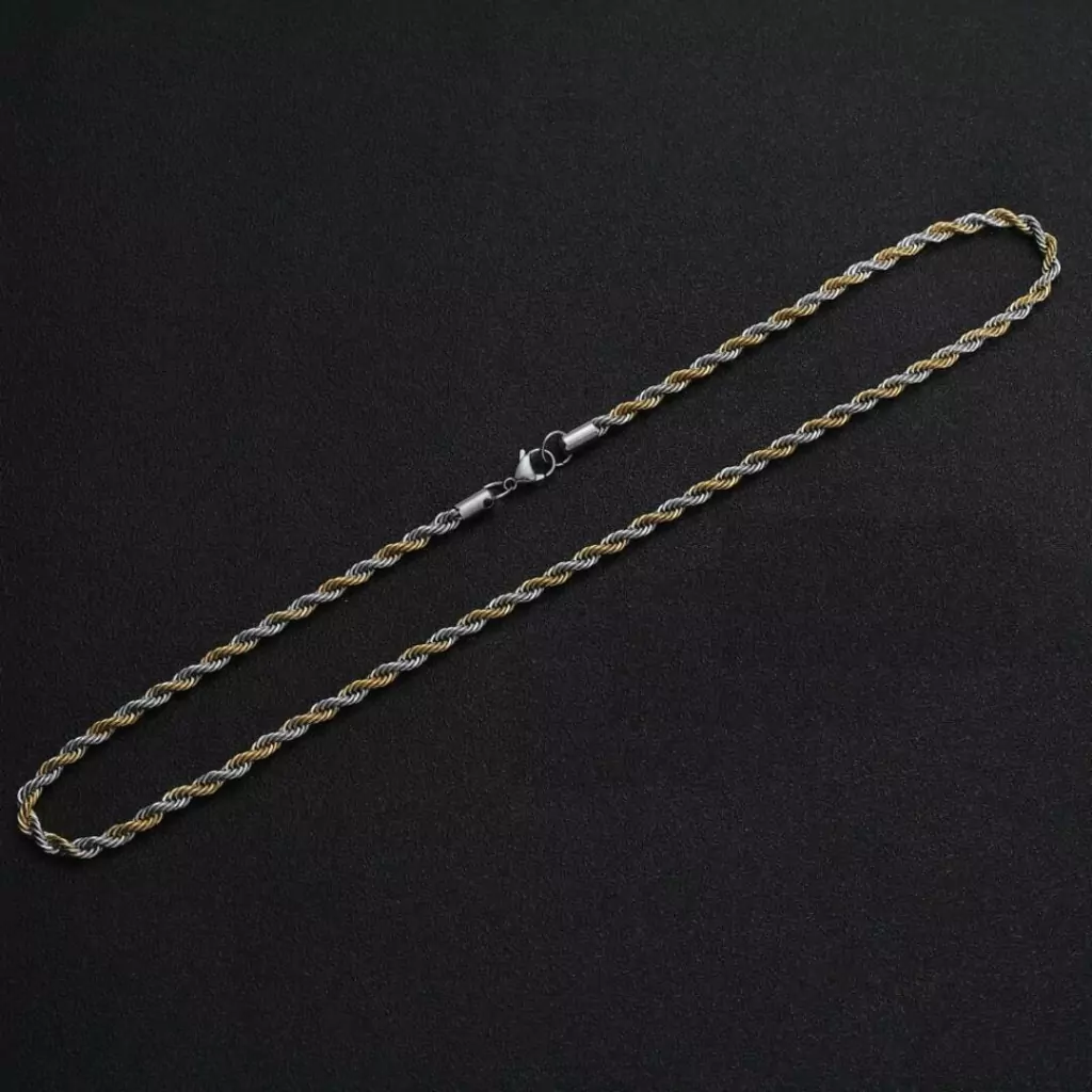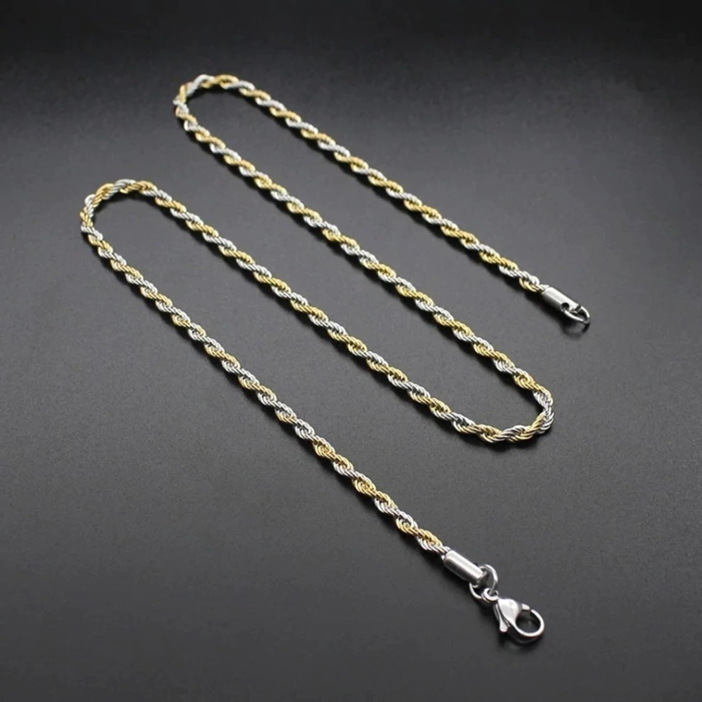 O Colar Elo Corda Prateado e Dourado é um acessório que impõe presença e refina qualquer visual. Seu design trançado com acabamento bicolor combina a resistência do Aço Inox 316L com um brilho impecável, garantindo durabilidade e sofisticação.