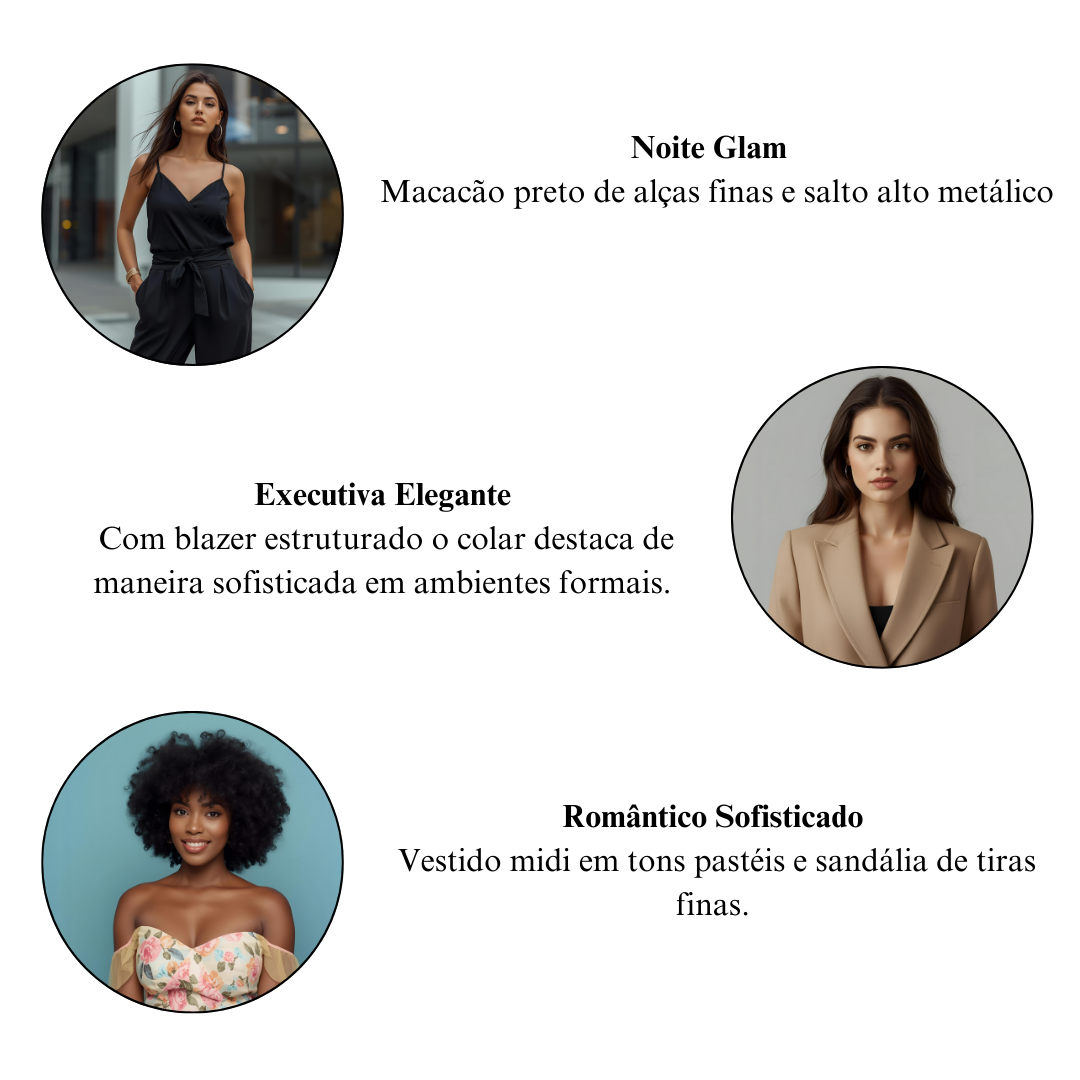 Esse colar ganha protagonismo sozinho, mas pode ser potencializado com brincos de pérolas pequenas ou argolas médias, criando harmonia. Se preferir ousar, combine com pulseiras prateadas ou douradas mais discretas, deixando o colar como destaque principal.