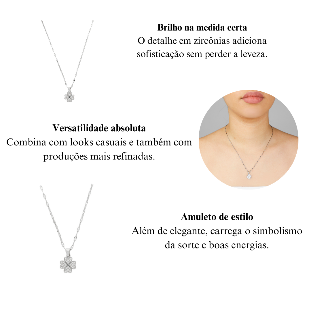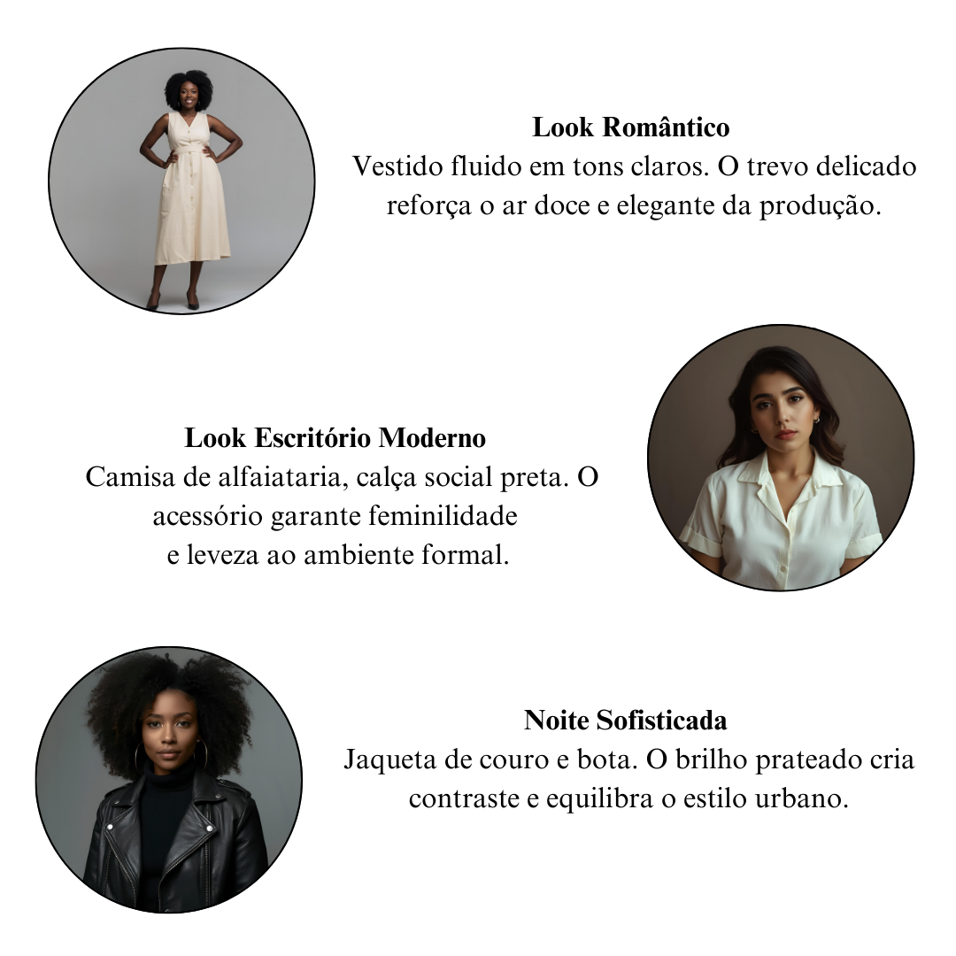 O Colar Trevo Prateado vai bem tanto sozinho, para um visual mais minimalista, quanto em mix de colares de diferentes tamanhos. Combine-o com chokers prateadas ou correntes médias para criar camadas elegantes. Nos brincos, aposte em argolas prateadas ou pontos de luz para manter a harmonia.