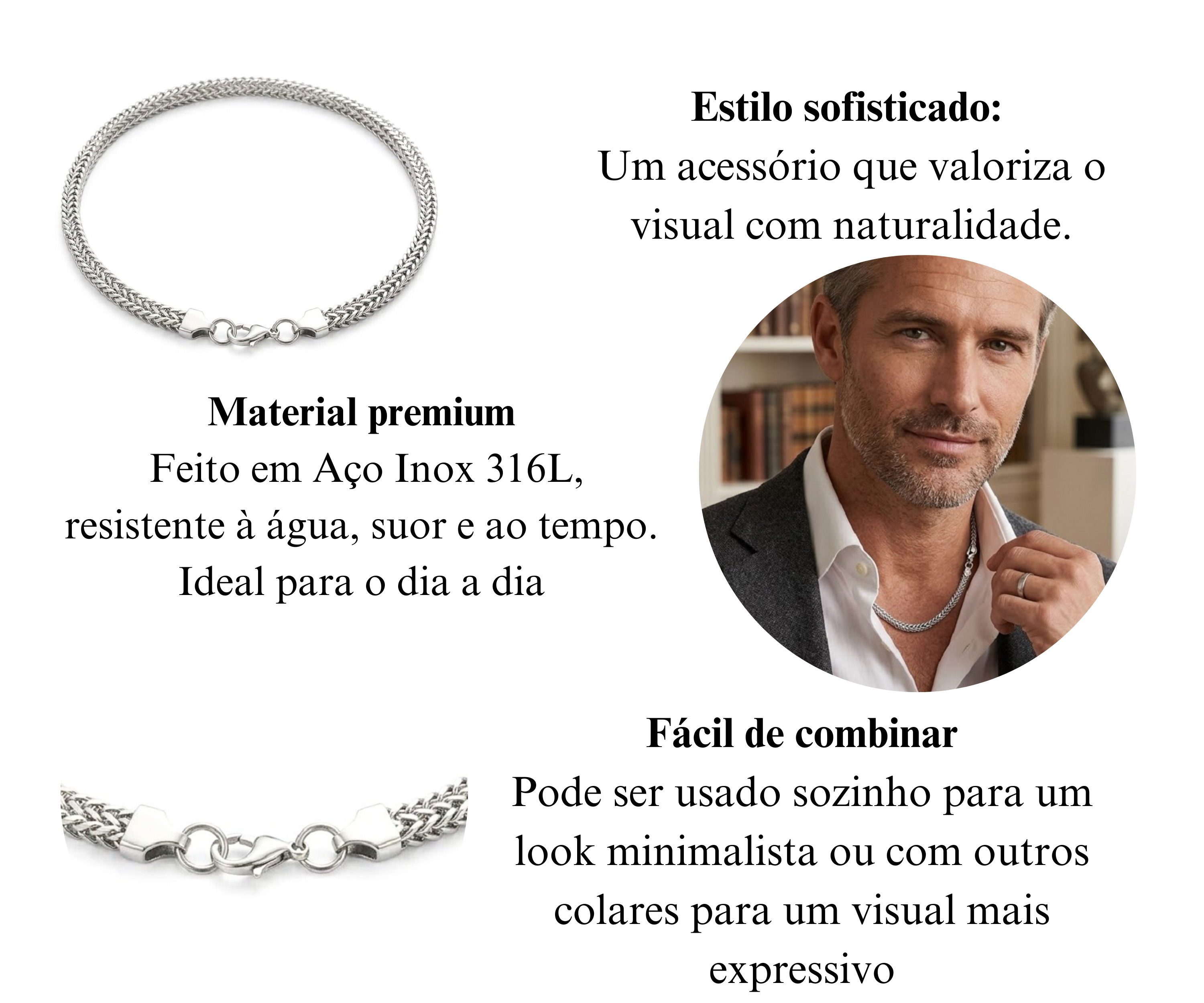 O Colar Aço Inox Prateado Vintage é a escolha perfeita para quem aprecia acessórios com personalidade e sofisticação atemporal. Seu design com elos trançados cria uma textura elegante e diferenciada, trazendo profundidade visual e um acabamento refinado que chama atenção de forma sutil. O brilho prateado do aço inox valoriza ainda mais a peça, refletindo luz de maneira discreta e sofisticada. Versátil e marcante ao mesmo tempo, este colar é ideal para quem deseja elevar o visual com um detalhe clássico que combina facilmente com diferentes estilos.