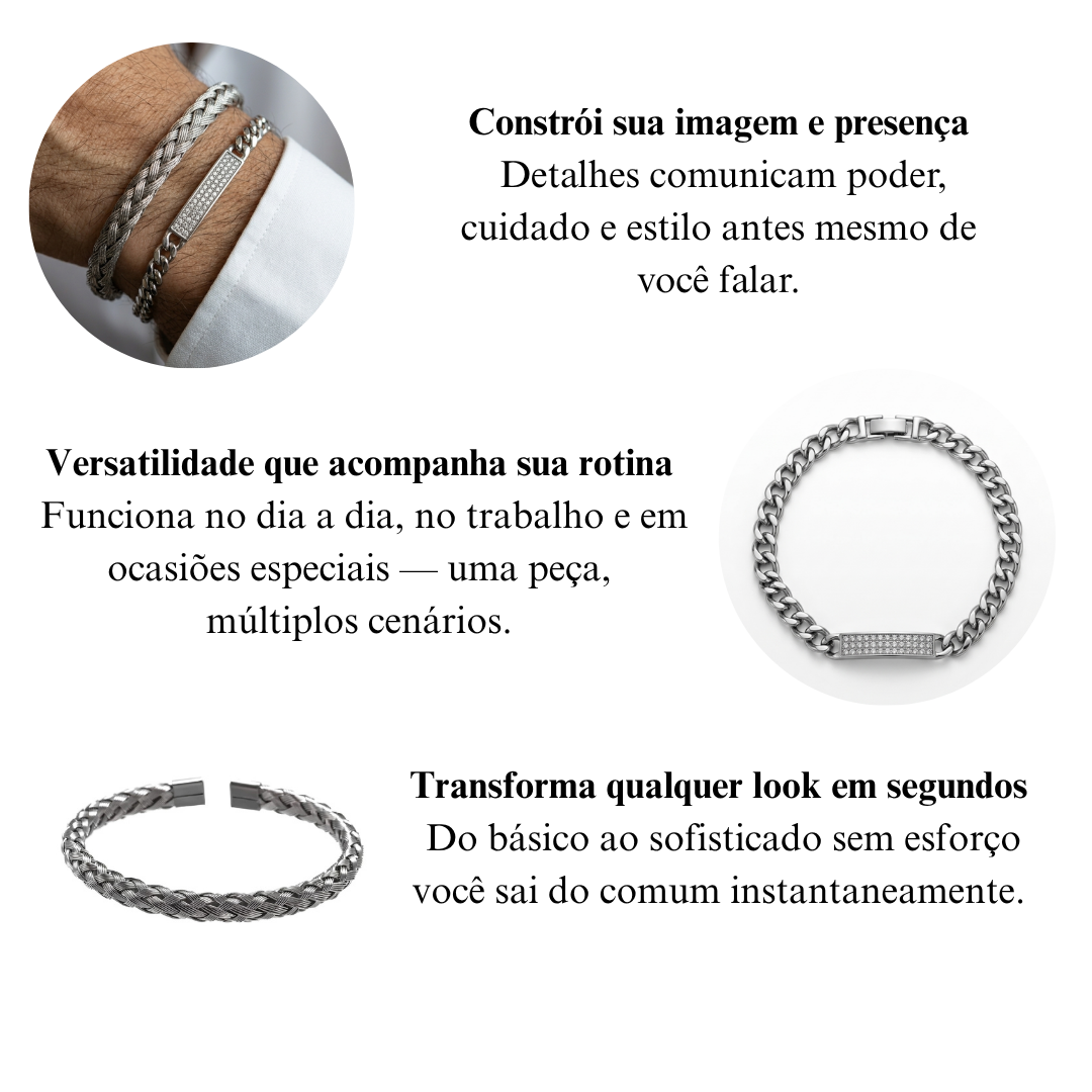 A combinação entre a pulseira trançada robusta e a corrente com placa sofisticada cria um contraste perfeito entre força e refinamento. O aço inoxidável prateado entrega brilho na medida certa, sem excessos, transmitindo uma estética moderna, limpa e extremamente masculina.