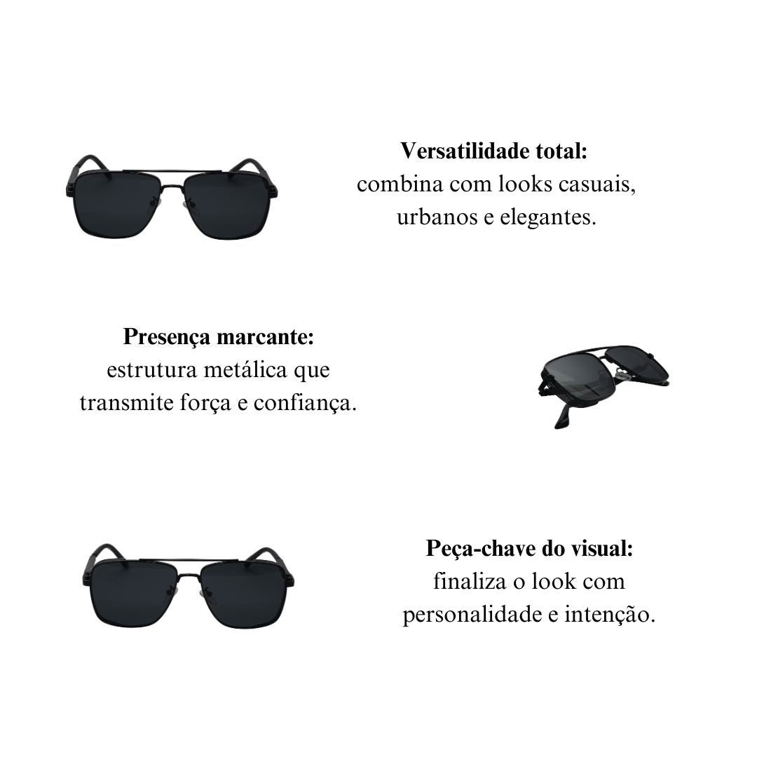 O Óculos de Sol Atlas é a definição de força silenciosa. Inspirado no clássico aviador, ele traz linhas limpas, estrutura metálica sofisticada e lentes escuras que transmitem confiança imediata. É o tipo de acessório que não precisa chamar atenção — ele naturalmente domina o visual.
