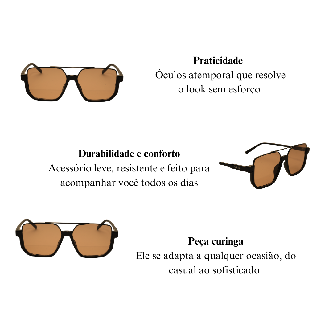 O Óculos de Sol Auctor traduz poder. Ele eleva o visual sem esforço e comunica presença, clareza e controle. Uma peça pensada para quem entende que estilo é linguagem e sabe exatamente o que quer dizer com ele. Seu design imponente, com linhas geométricas bem definidas e lentes em tom quente, transmite autoridade, maturidade e sofisticação na medida certa. É o tipo de acessório que não pede atenção: ele naturalmente atrai olhares.