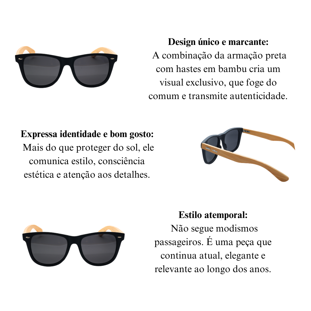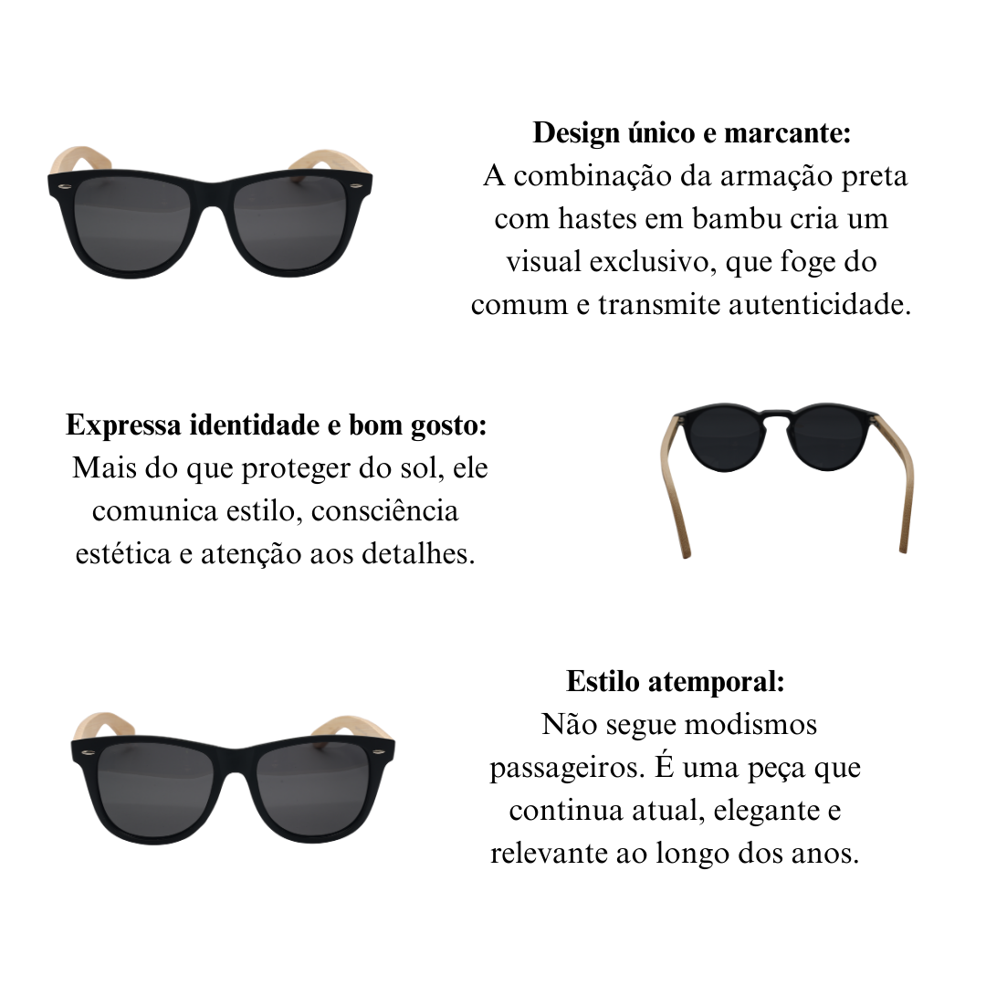 O Bamboo Black é a prova de que design, autenticidade e sofisticação podem andar juntos. Com visual marcante e detalhes naturais, ele entrega personalidade sem exageros, equilibrando o preto clássico com hastes em bambu que tornam a peça única. É aquele óculos que chama atenção pela estética — e permanece na memória pelo conceito.