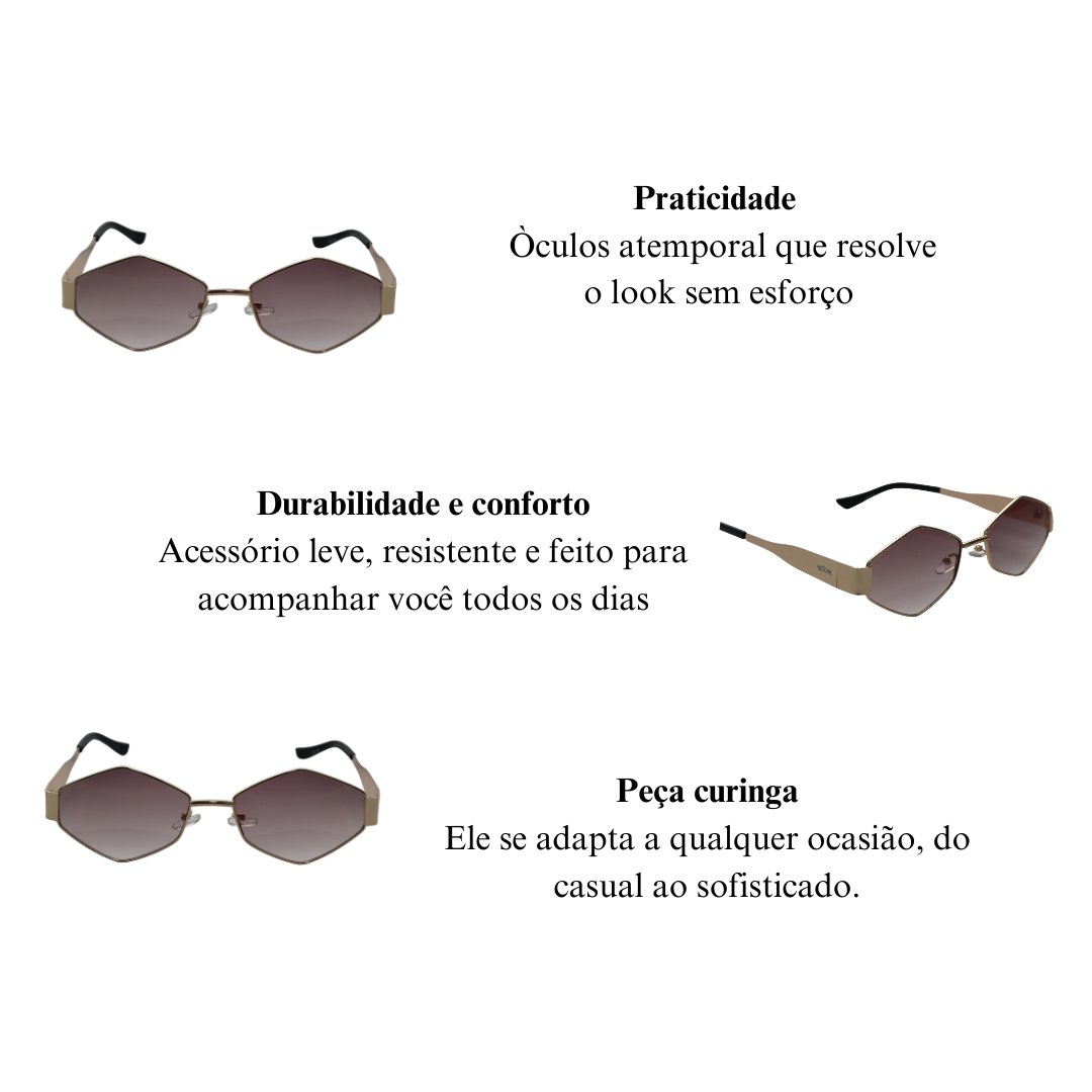 O Óculos de Sol Imperium é a tradução do luxo estratégico: sofisticado, imponente e absolutamente intencional. Seu formato geométrico com linhas finas douradas cria um visual refinado e poderoso, enquanto as lentes em tom degradê adicionam profundidade, mistério e elegância. É uma peça que comunica alto padrão sem excessos, feita para quem domina o próprio estilo com naturalidade.