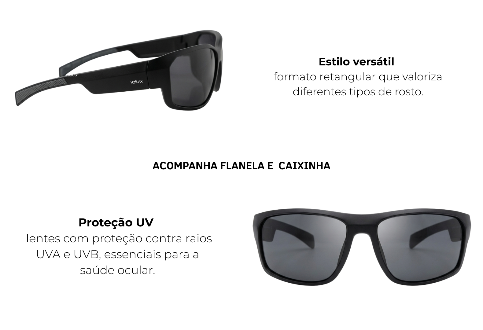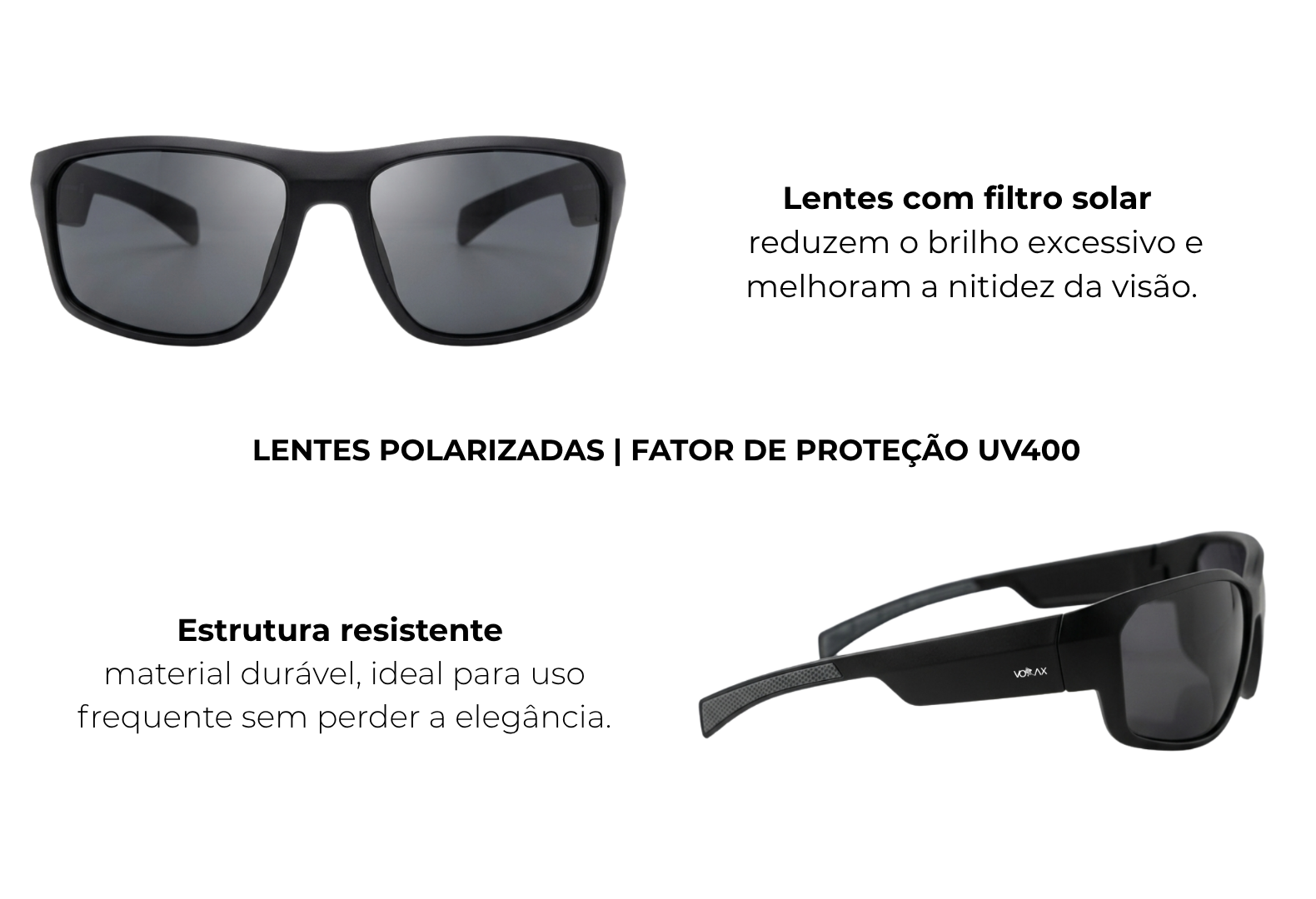 Lentes em policarbonato. Máxima qualidade óptica, livre de distorções, resistente a alto impacto e proteção total contra os raios UVA, UVB e UVC.