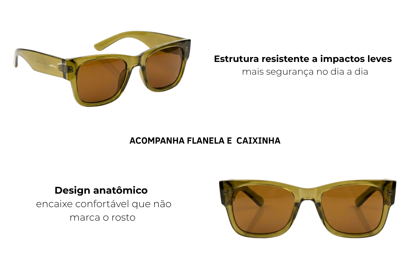 Lentes em policarbonato. Máxima qualidade óptica, livre de distorções, resistente a alto impacto e proteção total contra os raios UVA, UVB e UVC.