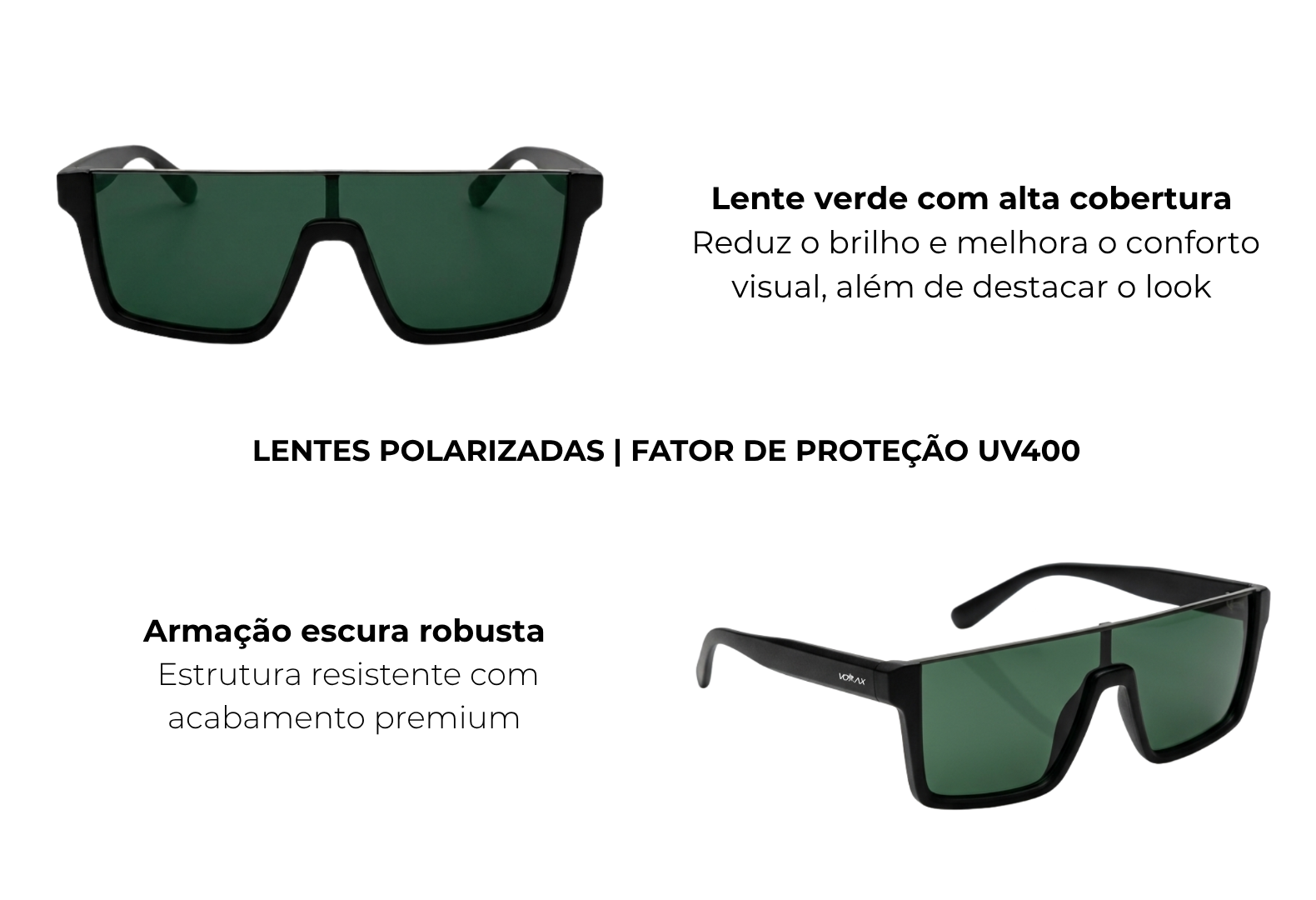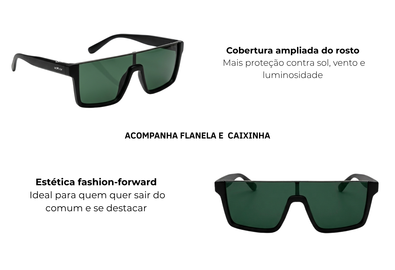 O Óculos Premium Green Shield é feito para quem quer ser visto. Com seu design visor único e lente verde intensa, ele entrega um visual futurista, moderno e extremamente marcante.
