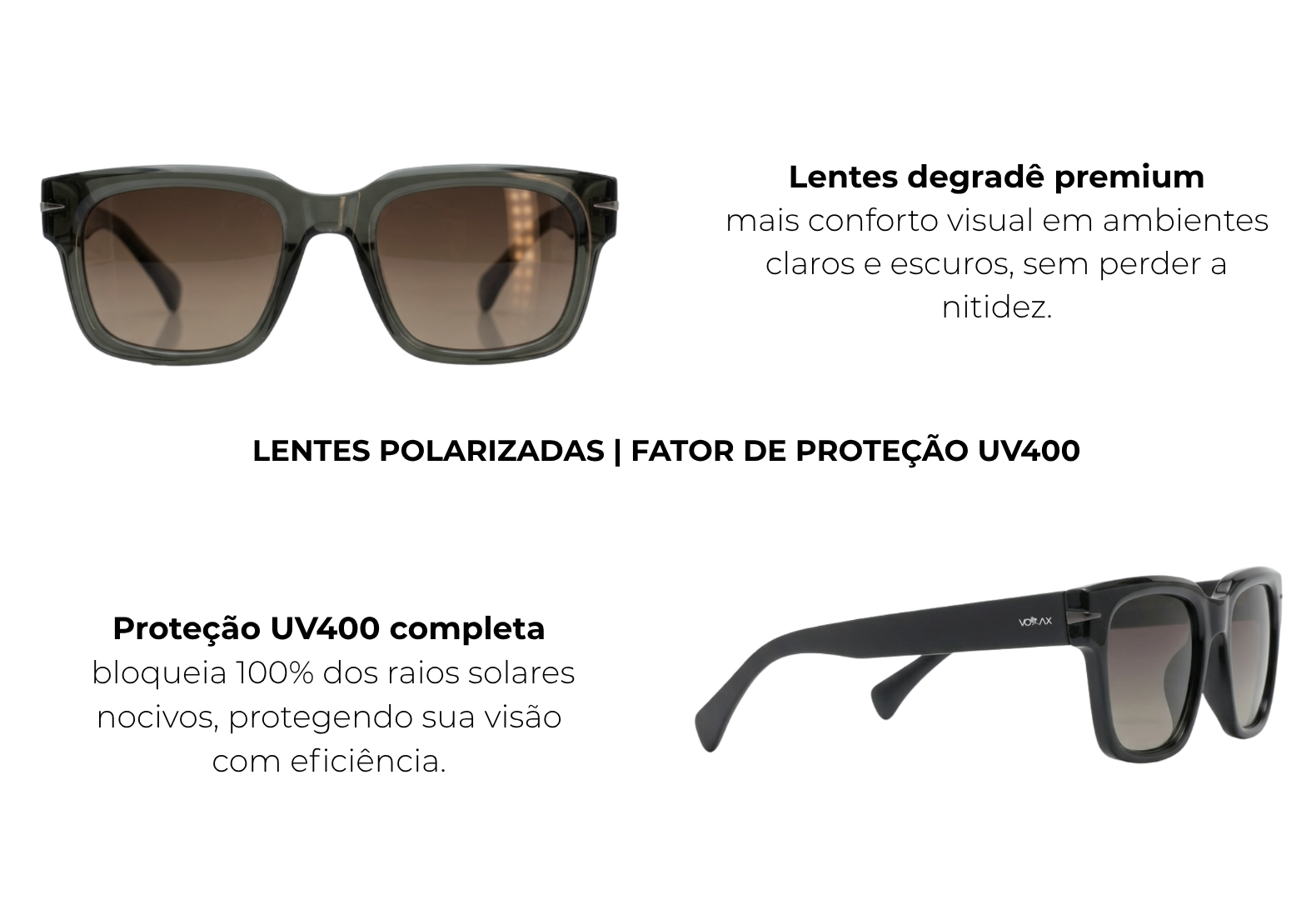 Lentes em policarbonato. Máxima qualidade óptica, livre de distorções, resistente a alto impacto e proteção total contra os raios UVA, UVB e UVC.