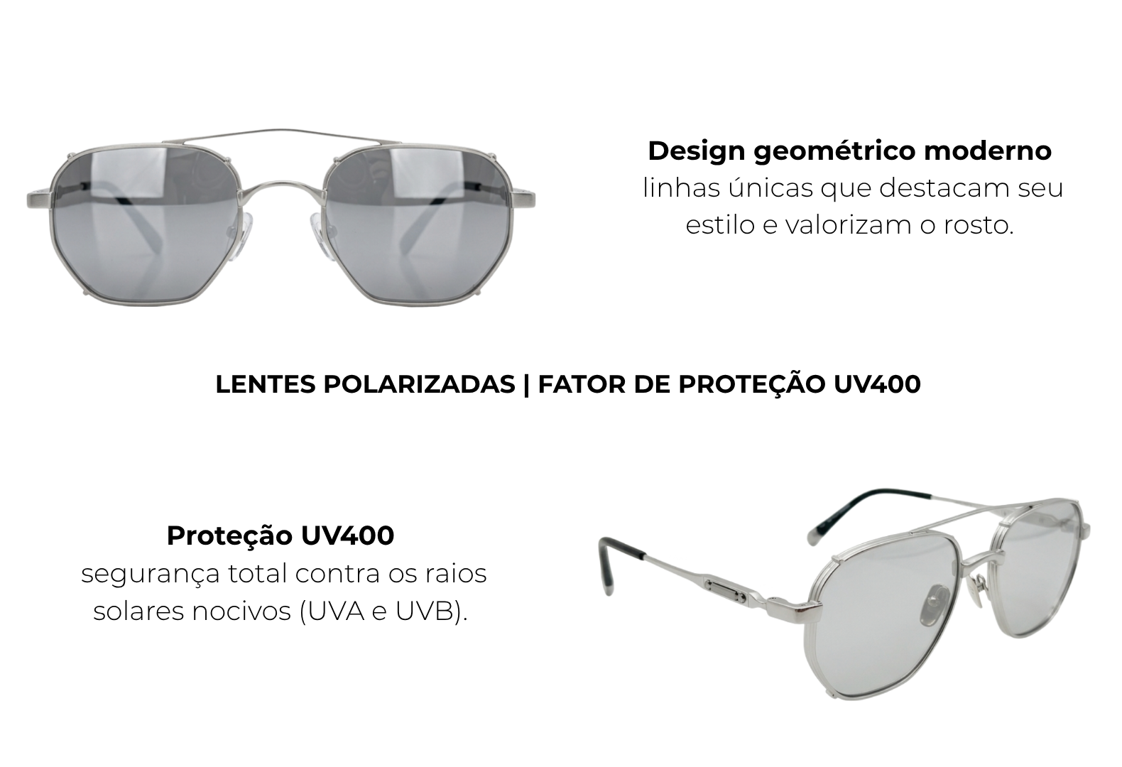 O Óculos de sol Premium Vértice Silver é a escolha certa. Com um design geométrico marcante e acabamento metálico sofisticado, ele combina modernidade e elegância em um equilíbrio perfeito.