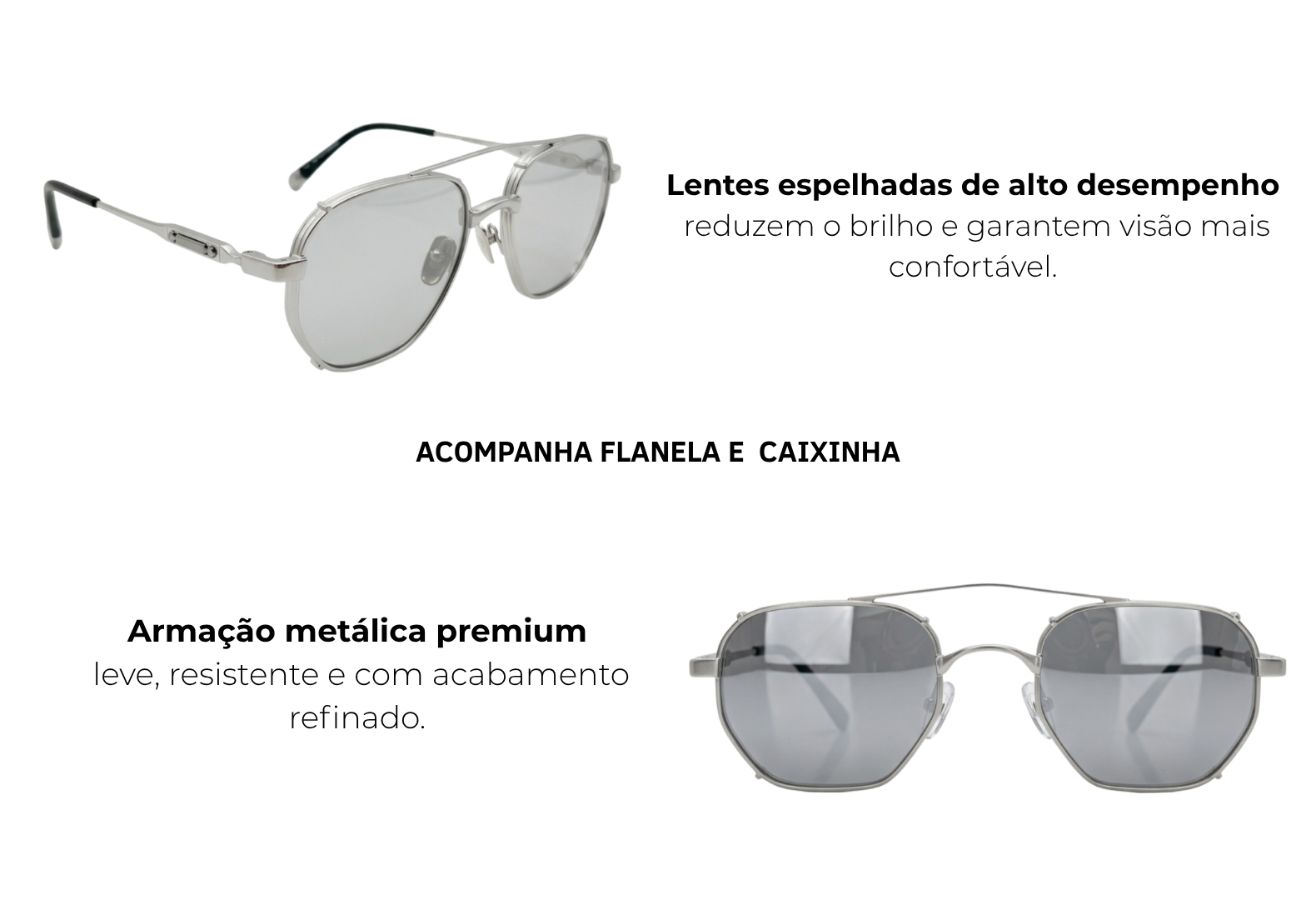 As lentes espelhadas em tom prata criam um efeito visual impactante, enquanto a estrutura leve proporciona conforto absoluto para o uso diário. É o tipo de peça que transmite confiança, presença e bom gosto sem precisar de esforço.