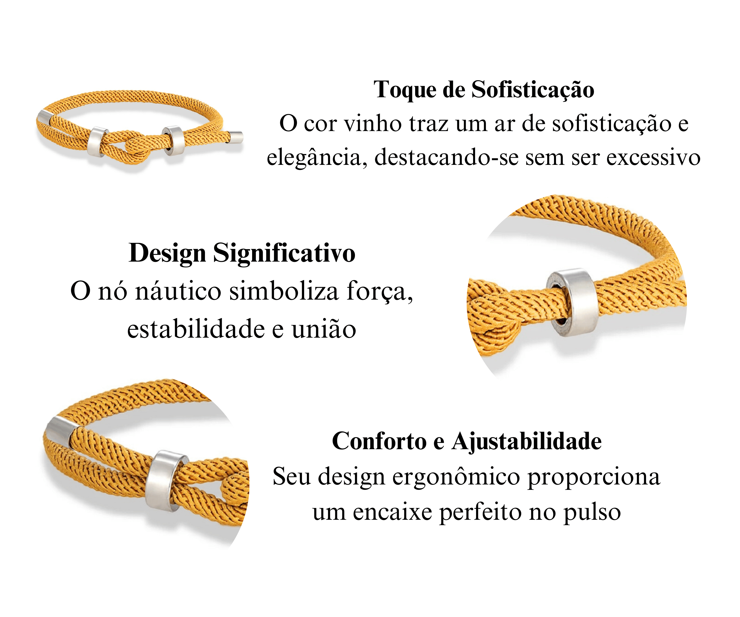 A Pulseira Nó Náutico Amarelo é o acessório ideal para quem busca um toque de sofisticação com um design inspirado no universo náutico. Feita em corda resistente na cor amarelo e com um fecho robusto em aço inox, essa pulseira une elegância e durabilidade para acompanhar o seu dia a dia. O nó central não é apenas um detalhe estético, mas também um símbolo de força, conexão e resiliência.