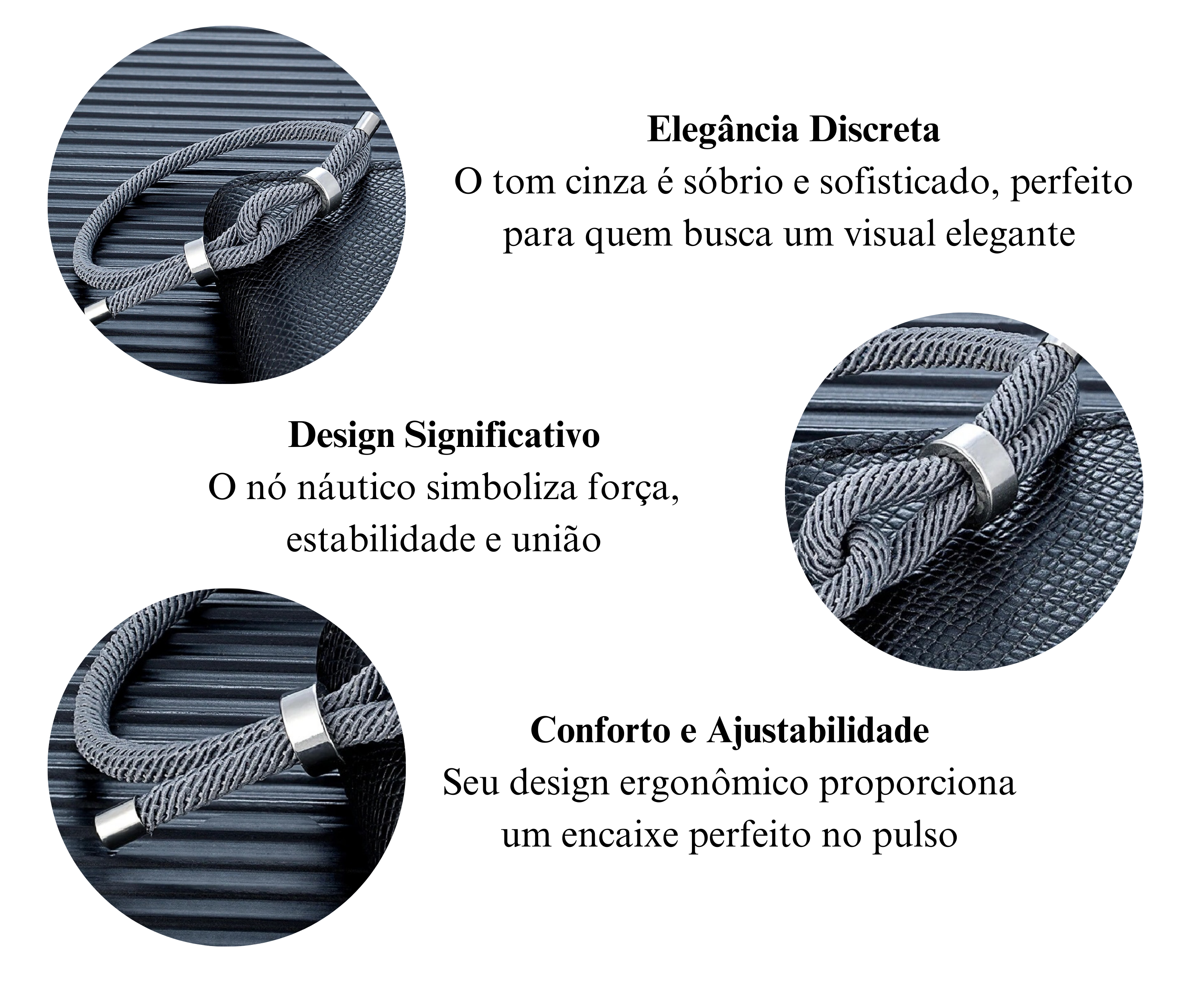 A Pulseira Nó Náutico Gray Color possui design elegante e simbólico, combina com qualquer ocasião e estilo e sem contar que é feita com materiais de alta qualidade para máxima durabilidade. Essa é uma escolha perfeita para quem busca um toque de sofisticação discreta.