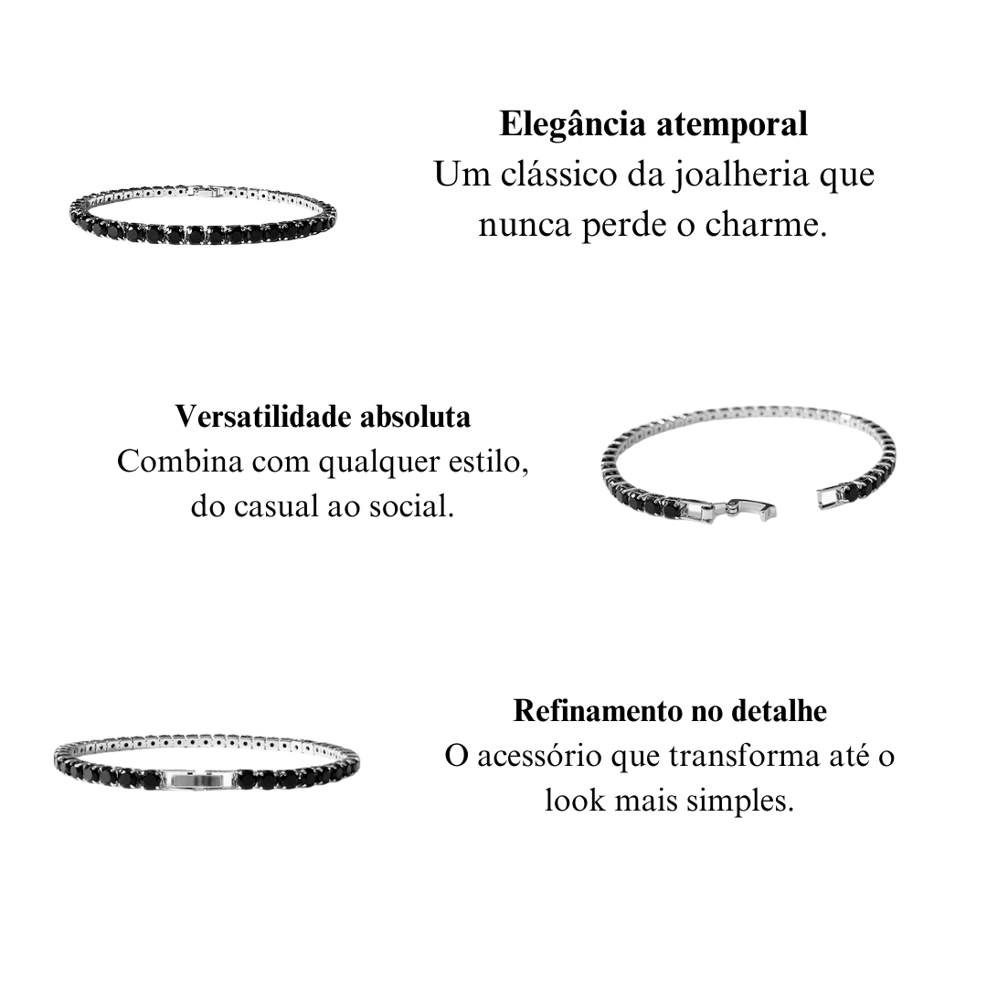 A Pulseira Riviera Negra é sinônimo de elegância atemporal. Com design clássico e cravejada de zircônias negras, ela reflete a luz de forma única, criando um efeito sofisticado e marcante. Uma peça que transmite luxo e sofisticação em qualquer ocasião, sendo indispensável para quem busca elevar o visual com um detalhe cheio de classe. Mais do que um acessório, a Riviera é o tipo de pulseira que nunca sai de moda e se adapta a qualquer estilo — do minimalista ao sofisticado.